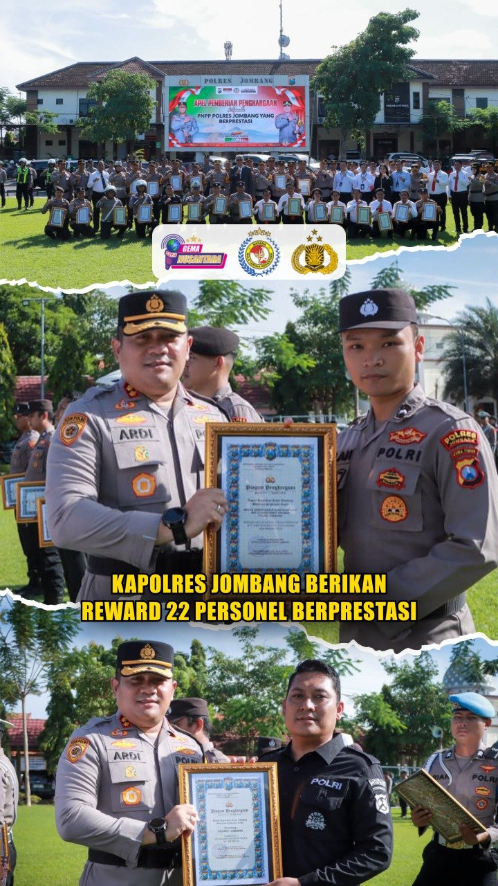 Jombang – Kapolres Jombang, AKBP Ardi Kurniawan, S.H., S.I.K., CPHR, memberikan penghargaan (reward) kepada 10 Subsatker dan 12 Pegawai Negeri Pada Polri (PNPP) Polres Jombang yang menunjukkan prestasi luar biasa dalam pelaksanaan tugas. Senin (29/12/2025) di Lapangan Polres Jombang sebagai bentuk apresiasi atas dedikasi, integritas, dan kinerja optimal personel dalam menjaga keamanan dan ketertiban masyarakat.