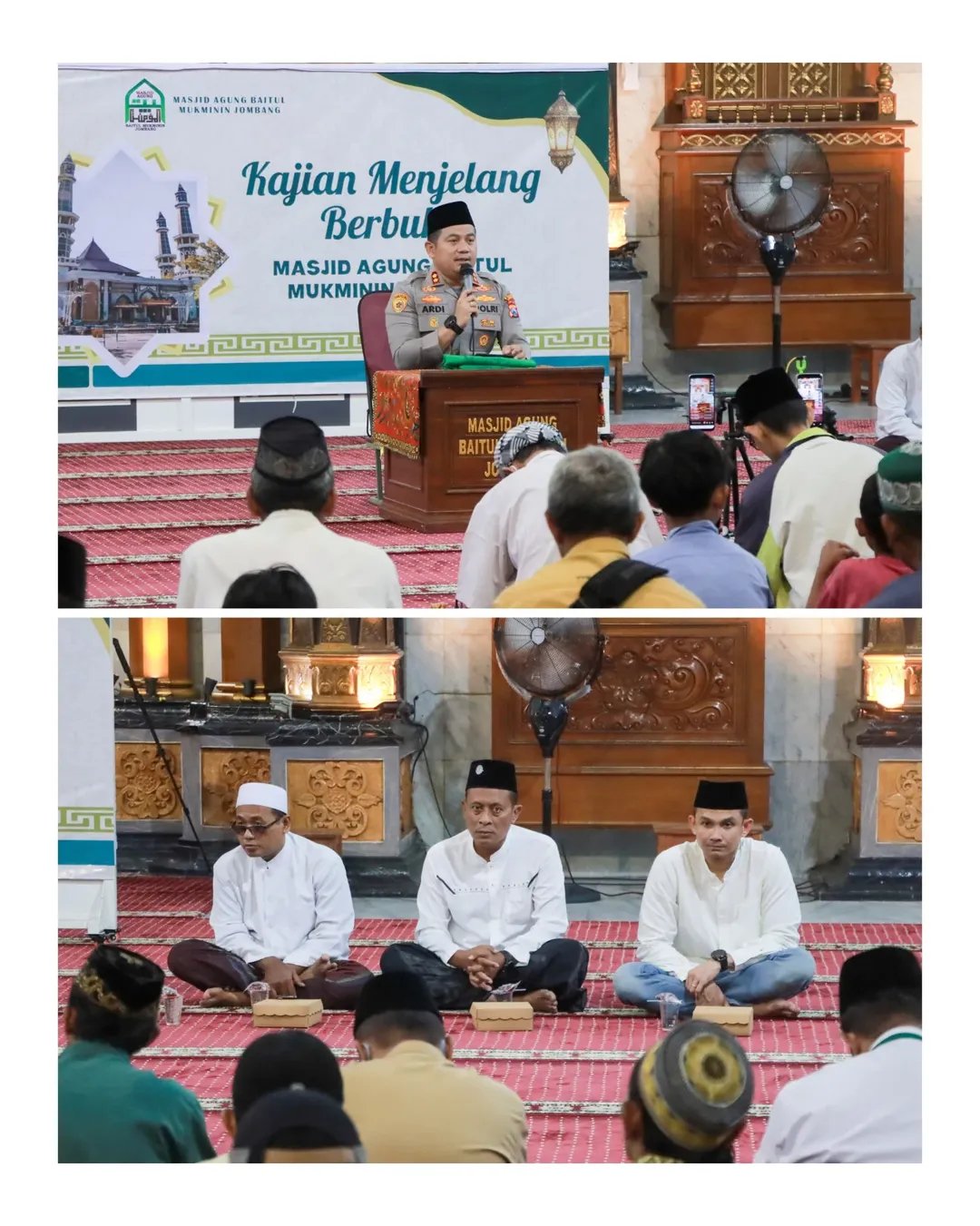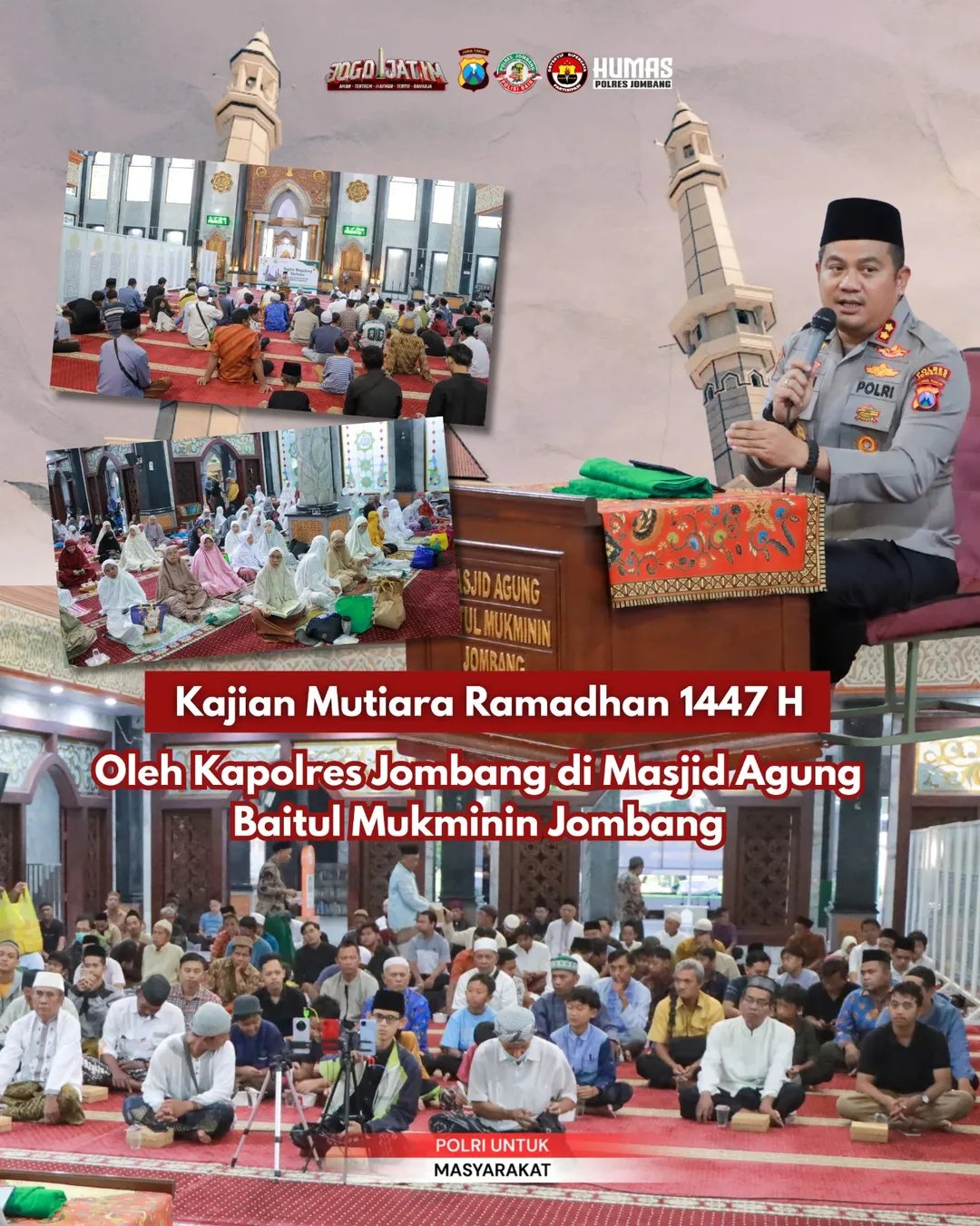 Jombang – Kapolres Jombang AKBP Ardi Kurniawan, S.H., S.I.K., CPHR., hadir sebagai narasumber dalam kegiatan Kajian Mutiara Ramadhan 1447 H yang diselenggarakan di Masjid Agung Baitul Mukminin Jombang.