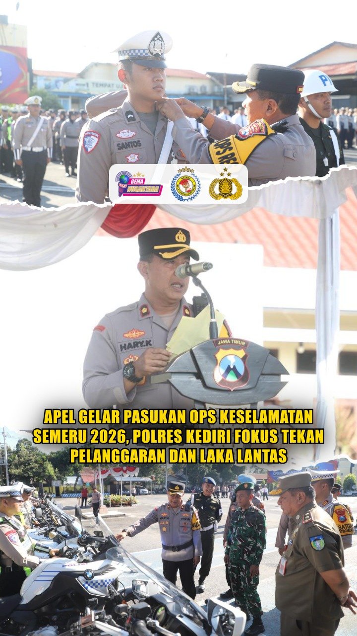 KEDIRI — Polres Kediri melaksanakan Apel Gelar Pasukan Operasi Keselamatan Semeru 2026 di Lapangan Apel Mapolres Kediri, Senin (2/2/2026). Dipimpin Wakapolres Kediri Kompol Hari Kurniawan, S.H., M.H., dan diikuti jajaran Polres Kediri bersama unsur Forkopimda dan instansi terkait.