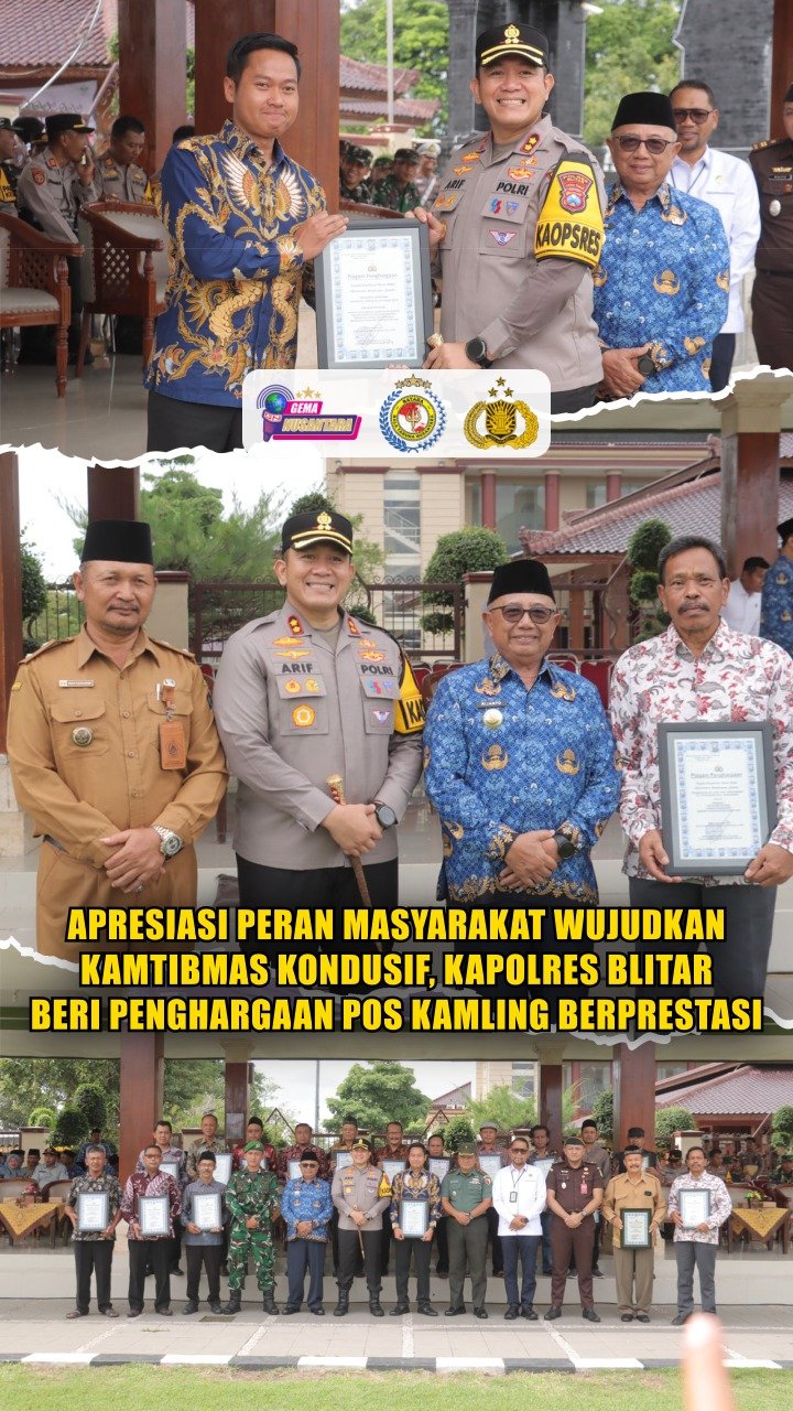 Blitar – Kapolres Blitar AKBP Arif Fazlurrahman, S.H., S.I.K., M.Si., memberikan penghargaan kepada pos kamling berprestasi sebagai bentuk apresiasi atas peran masyarakat dalam menjaga kamtibmas. Berlangsung di Kantor Kabupaten Blitar, Senin, 17 November 2025. Turut hadir Bupati Blitar Drs. Rijanto, M.M., serta perwakilan Forkopimda Kabupaten Blitar.