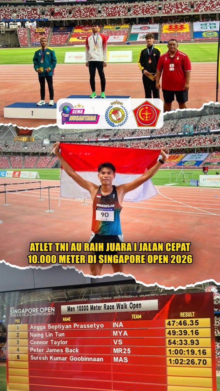 PUSPEN TNI – Atlet TNI AU, Serda Angga Septiyan Prassetyo, meraih juara pertama nomor jalan cepat 10.000 meter pada ajang Singapore Open Track & Field Championship 2026 yang berlangsung di Singapura, Jumat (17/4/2026).
