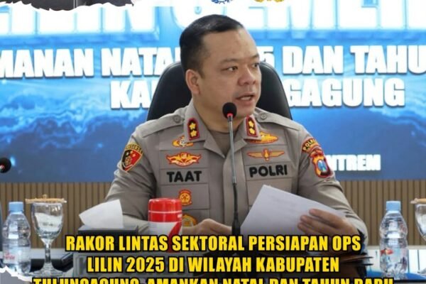 Tulungagung – Kapolres Tulungagung AKBP Muhammad Taat Resdi, S.H., S.I.K., MTCP., pimpin langsung Rakor Lintas Sektoral Operasi Lilin Semeru 2025 dalam rangka pengamanan Natal 2025 dan Tahun Baru 2026 di Kabupaten Tulungagung, bersama unsur Forkopimda Tulungagung dan instansi terkait,berlangsung di ruang Saja Arya Racana (SAR) Polres Tulungagung Polda Jatim, Selasa (16/12/2025). Kapolres melalui Kasihumas Polres…