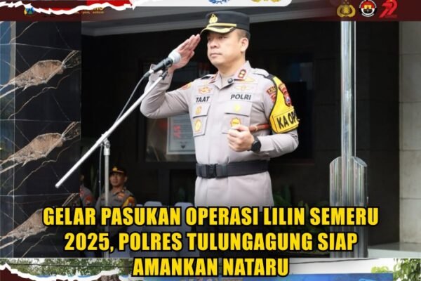 Tulungagung – Siap Amankan Natal dan Tahun Baru (Nataru), Polres Tulungagung gelar Apel Pasukan Operasi Lilin Semeru 2025 di halaman Mapolres setempat, Jumat (19/12/2025). Dihadiri Forkopimda, PJU Polres, serta instansi terkait. Kapolres Tulungagung AKBP Muhammad Taat Resdi, S.H., S.I.K., MTCP., mengungkapkan operasi lilin Semeru 2025 dengan sasaran pengamanan rangkaian kegiatan Natal 2025 dan tahun baru…