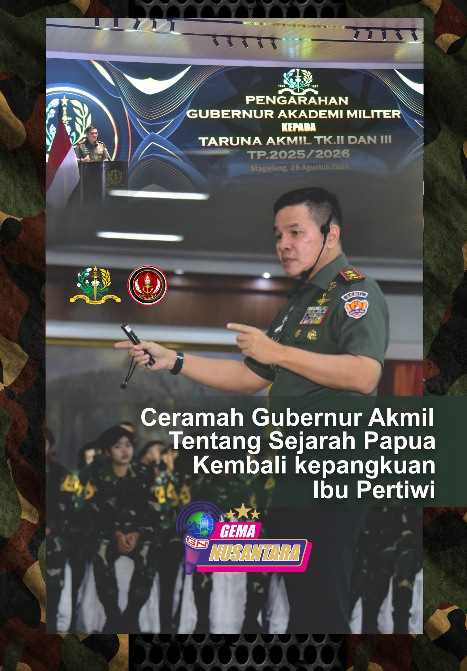 Magelang, 25 Agustus 2025 – Gubernur Akmil Mayjen TNI Rano Tilaar memberikan pengarahan kepada Taruna Akmil Tingkat II dan Tingkat III Tahun Pendidikan 2025/2026. Berlangsung di Gedung Moch. Lily Rochli, Akmil Magelang, dengan materi khusus mengenai ”Sejarah Papua Kembali ke Pangkuan Ibu Pertiwi”.