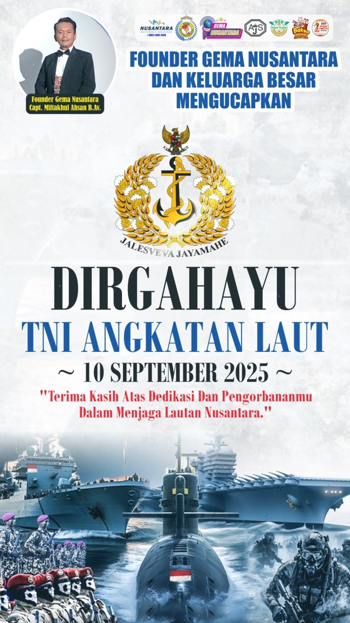 Founder Gema Nusantara Capt. Miftakhul Ahsan B.Av. Dan Keluarga Besar Mengucapkan Dirgahayu TNI Angkatan Laut, 10 September 2025.