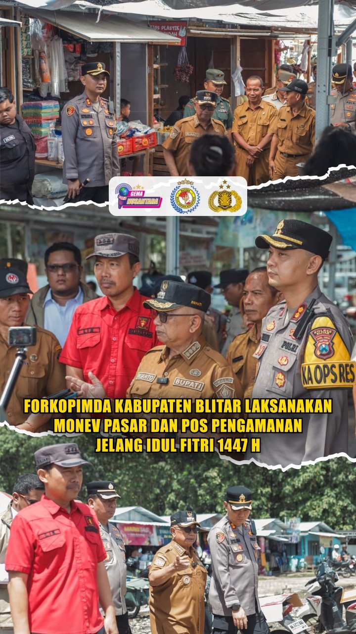 Blitar – Forkopimda Kabupaten Blitar melaksanakan kegiatan monitoring dan evaluasi (monev) terhadap pasar serta pos pengamanan pada Senin (16/3/2026). Diikuti oleh Kapolres Blitar AKBP Rivanda, S.I.K., bersama Bupati Blitar dan jajaran Forkopimda Kabupaten Blitar.