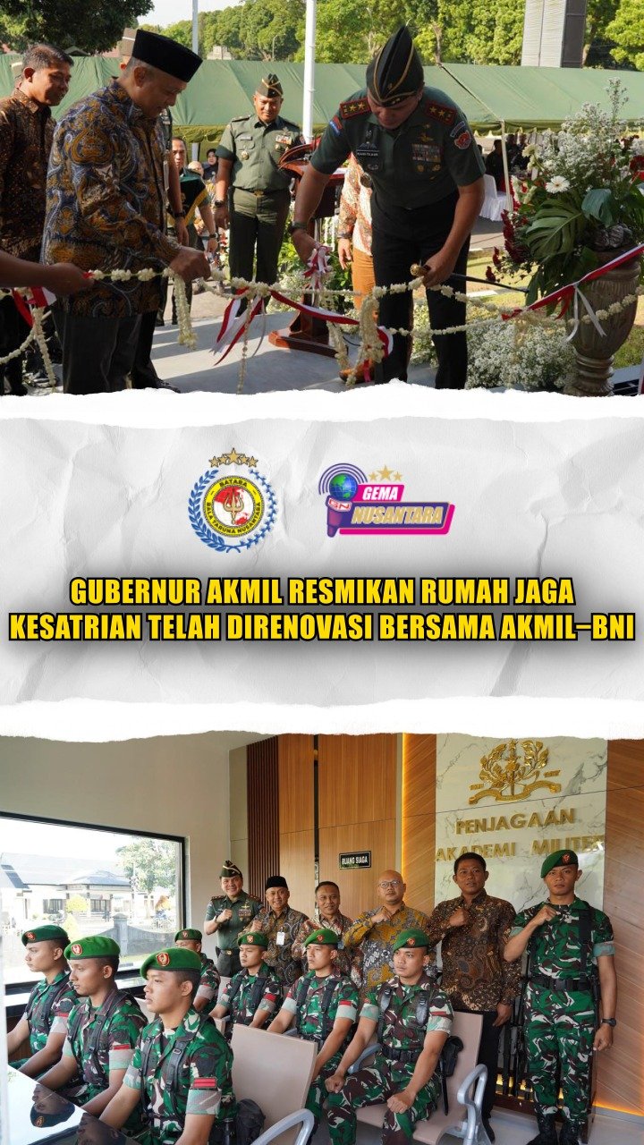 Magelang – Gubernur Akmil Mayjen TNI Rano Maxim Adolf Tilaar, S.E., meresmikan Rumah Jaga Kesatrian Akademi Militer yang berlokasi di depan pintu satu masuk Kesatrian Akmil Magelang. Turut didampingi Kepala Regional CEO BNI Kantor Wilayah 17 Yogyakarta, Ariyanto Soewondo Geni, Selasa, 25 November 2025.
