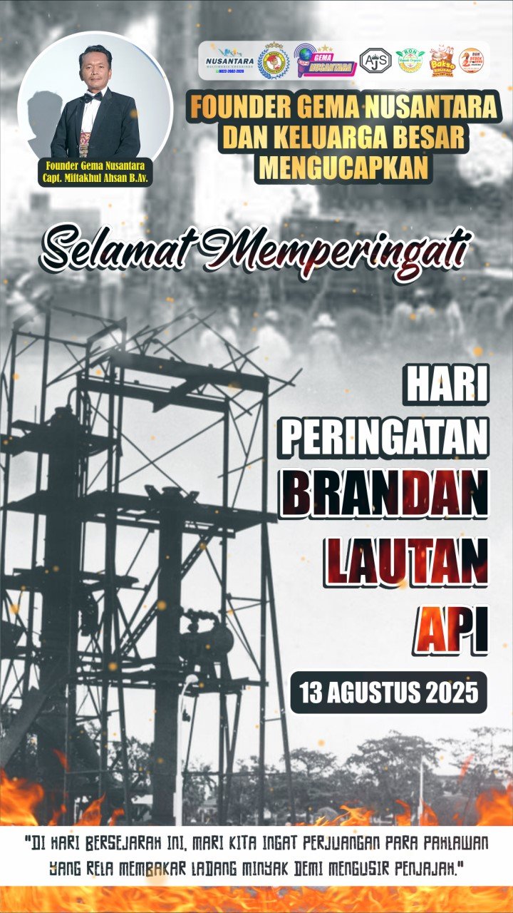 Founder Gema Nusantara Capt. Miftakhul Ahsan B.Av. Dan Keluarga Besar Mengucapkan Selamat Memperingati Hari Peringatan Brandan Lautan Api, 13 Agustus 2025.