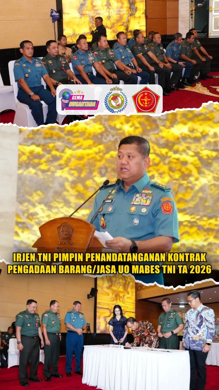 (Puspen TNI). Panglima TNI Jenderal TNI Agus Subiyanto, S.E., M.Si., diwakili Irjen TNI Laksdya TNI Hersan memimpin acara Penandatanganan Kontrak Pengadaan Barang/Jasa secara kolektif UO Mabes TNI Tahun Anggaran 2026 sebanyak 49 Kontrak. Berlangsung di Aula Gatot Subroto Mabes TNI, Cilangkap, Jakarta Timur, Rabu (28/01/2026).
