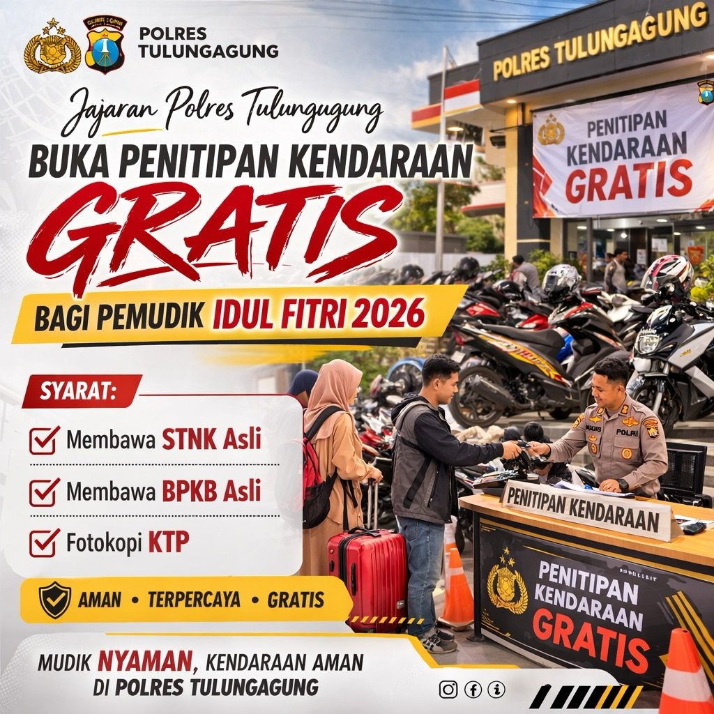 Tulungagung – Menjelang libur Hari Raya Idul Fitri 2026, jajaran Polres Tulungagung membuka layanan penitipan kendaraan gratis bagi masyarakat yang akan mudik atau bepergian. Disediakan di Polres Tulungagung maupun di seluruh Polsek jajaran Polres Tulungagung.