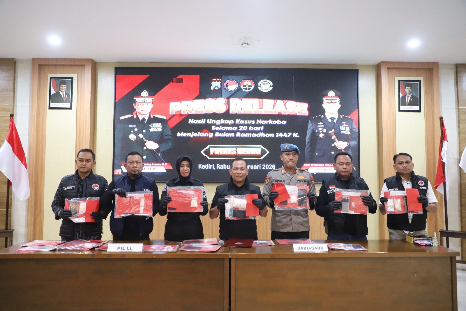 Sejak 28 Januari hingga 19 Februari 2026, Polres Kediri Polda Jatim berhasil mengungkap sebanyak 22 kasus narkoba dengan total 26 tersangka. 19 orang berperan sebagai pengedar dan 7 orang sebagai pemakai. Lima tersangka merupakan residivis kasus serupa.