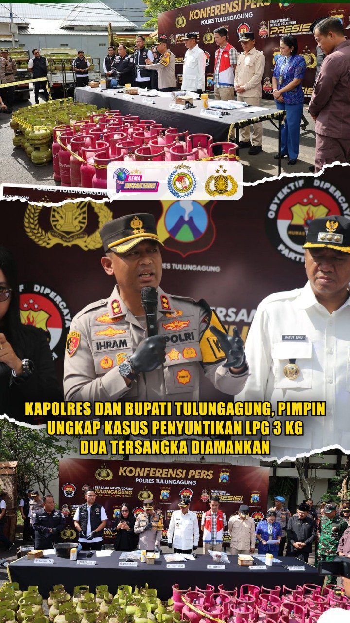 TULUNGAGUNG – Polres Tulungagung berhasil mengungkap tindak pidana penyuntikan gas LPG subsidi 3 kilogram (gas melon) ke tabung LPG non-subsidi ukuran 12 kilogram yang diduga menjadi penyebab kelangkaan gas di sejumlah wilayah Kabupaten Tulungagung. Disampaikan langsung oleh Kapolres Tulungagung AKBP Dr. Ihram Kustarto, S.H., S.I.K., M.Si., M.H., di dampingi Bupati Gatut Sunu kepada awak media, Kamis (12/03/2026).