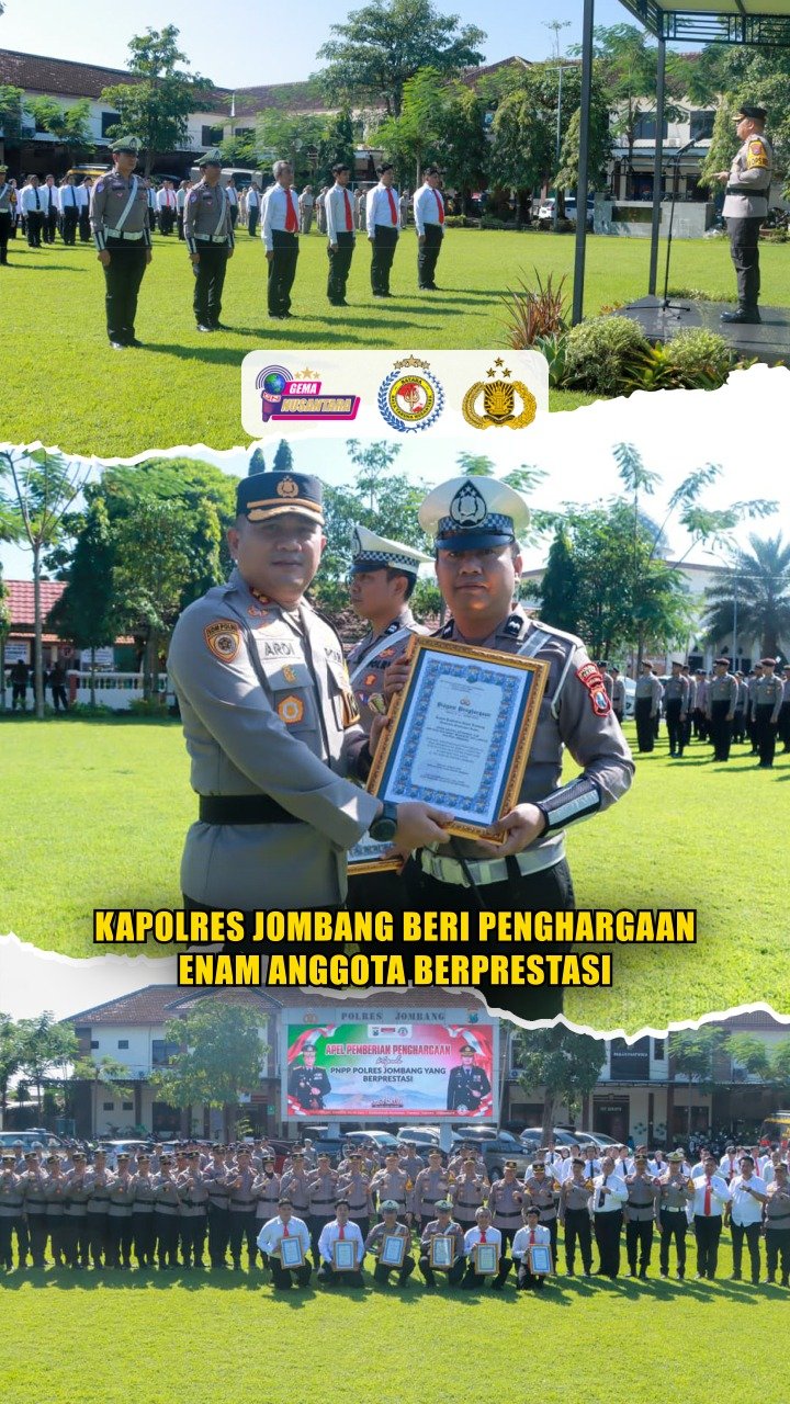 Jombang – Kapolres Jombang AKBP Ardi Kurniawan, S.H., S.I.K., CPHR., memberikan penghargaan kepada enam anggota dari Polres Jombang dan jajaran polsek yang dinilai berprestasi dalam pelaksanaan tugas. Berlangsung di Lapangan Polres Jombang, Senin (16/3/2026). Turut dihadiri oleh Wakapolres Jombang Kompol Syarlis, S.I.K., M.I.K. para pejabat utama, Kapolsek jajaran, serta personel lainnya.