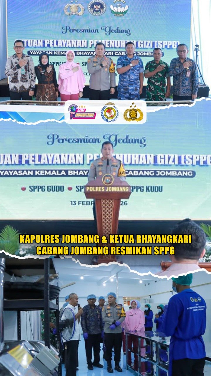 Jombang – Kapolres Jombang AKBP Ardi Kurniawan, S.H., S.I.K., CPHR., bersama Ketua Pengurus Yayasan Kemala Bhayangkari Cabang Jombang Ny. Olivia Ardi melaksanakan peresmian SPPG Yayasan Kemala Bhayangkari Cabang Jombang untuk wilayah Kecamatan Kudu, Gudo, dan Perak, yang dipusatkan di SPPG Gudo, Jum’at 13 Februari 2026.