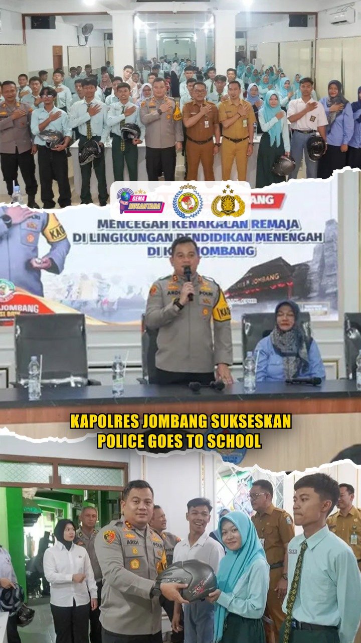 Jombang – Kapolres Jombang AKBP Ardi Kurniawan, S.H., S.I.K., CPHR., melaksanakan kegiatan Police Goes to School di SMK PGRI 1 Jombang sebagai langkah preventif dalam memberikan edukasi kamtibmas kepada pelajar, sekaligus membangun kesadaran generasi muda agar lebih bijak dalam pergaulan dan penggunaan media sosial.