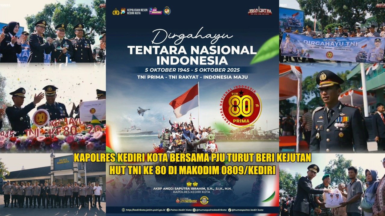 Kediri Kota – Kapolres Kediri Kota AKBP Anggi Saputra Ibrahim, S.H., S.I.K., M.H., menghadiri acara surprise dalam rangka HUT TNI ke-80 yang digelar di Makodim 0809/Kediri, (5/10/2025) di hadiri Wali Kota Kediri, jajaran Forkopimda Kota Kediri, serta para prajurit TNI dan anggota Polri.
