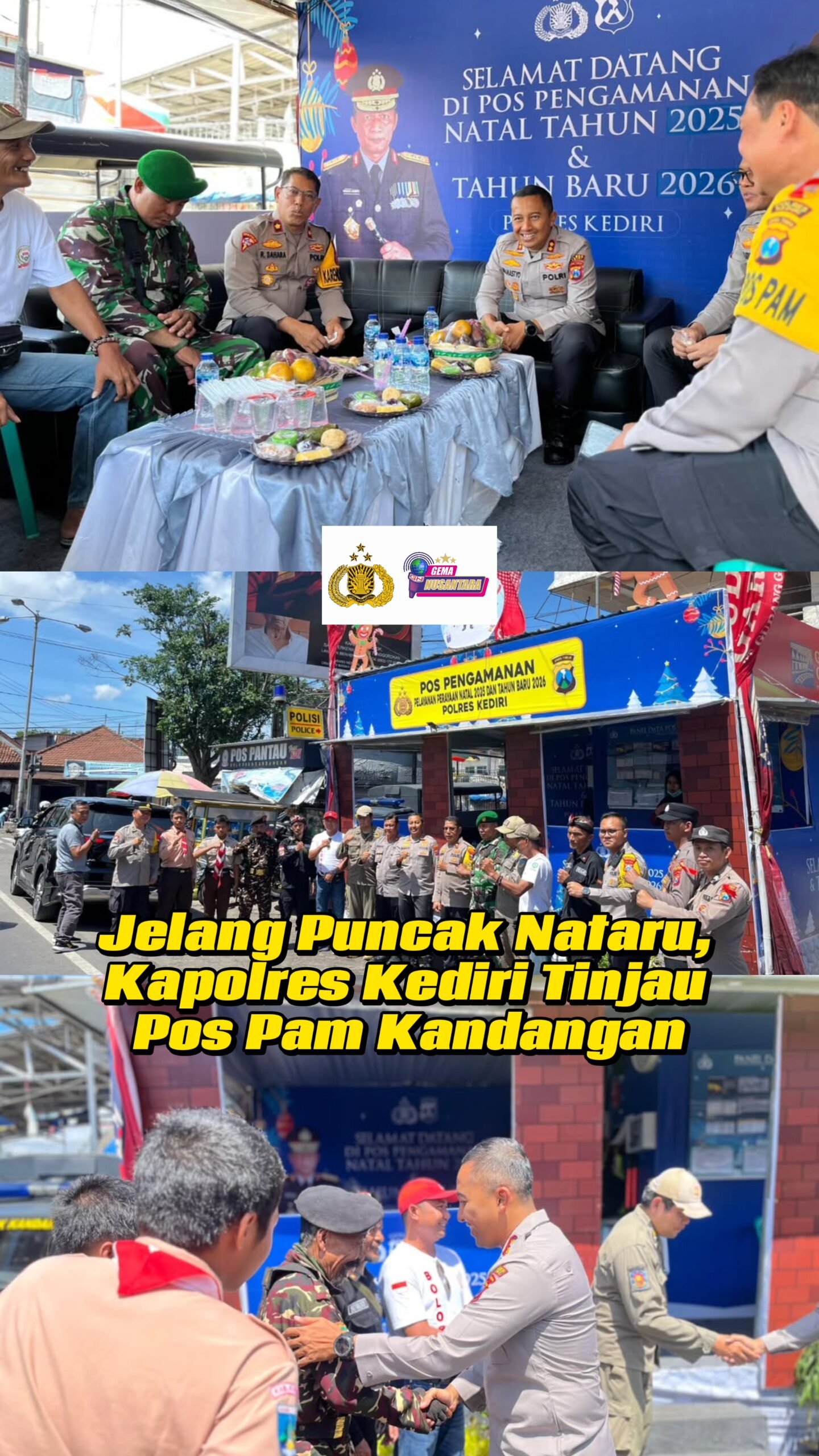 KEDIRI– Selasa (23/12/2025), Kapolres Kediri AKBP Bramastyo Priaji, S.H., S.I.K., M.Si. di dampingi PJU Polres meninjau langsung Pos Pengamanan (Pos Pam) di depan Pasar Kandangan, Kecamatan Kandangan, Kabupaten Kediri. Sebagai bagian dari rangkaian pengecekan kesiapan personel dan sarana pendukung Operasi Lilin Semeru 2025.