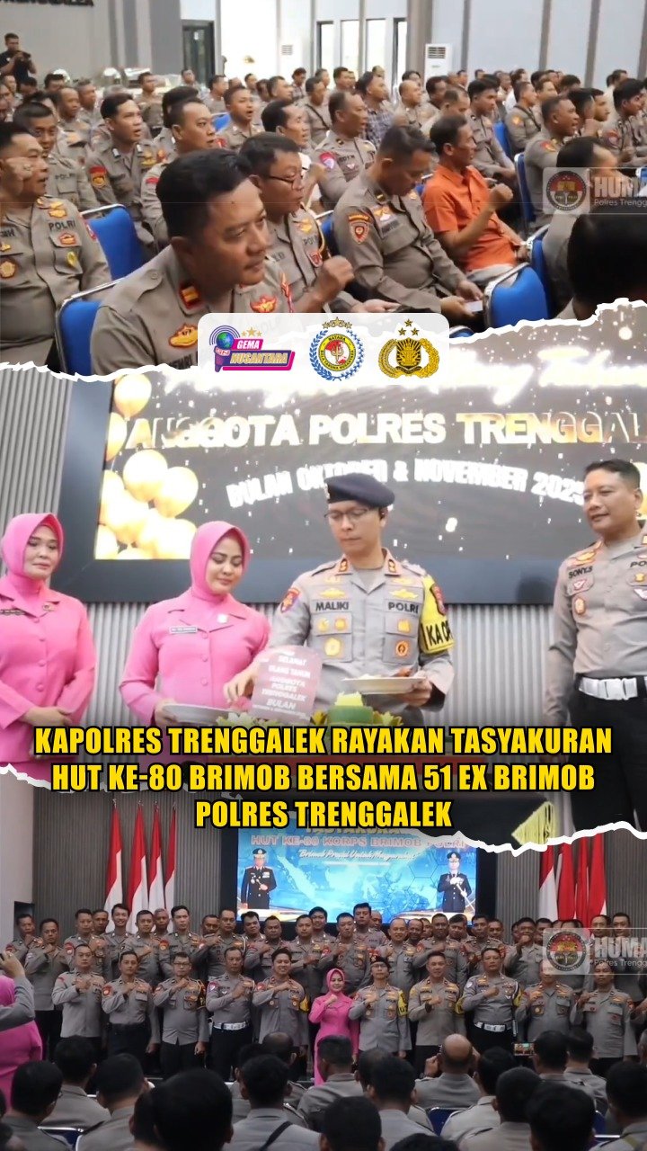 Polres Trenggalek – Kapolres Trenggalek AKBP Ridwan Maliki, S.H., S.I.K., M.I.K., turut merayakan Tasyakuran dalam rangka HUT ke-80 Brimob bersama 51 Ex Brimob Polres Trenggalek, berlangsung di Aula Tatag Trawang Tungga Mapolres Trenggalek. Selasa, (18/11).