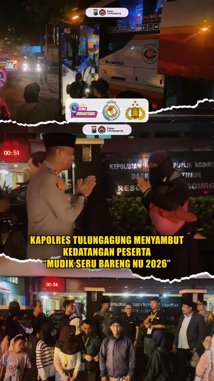 Tulungagung – Kapolres Tulungagung AKBP Dr. Ihram Kustarto, S.H., S.I.K., M.Si., M.H., bersama PJU menyambut kedatangan peserta “Mudik Seru bareng Nahdlatul Ulama (NU) 2026” di halaman Polres Tulungagung. Senin 16 Maret 2026.