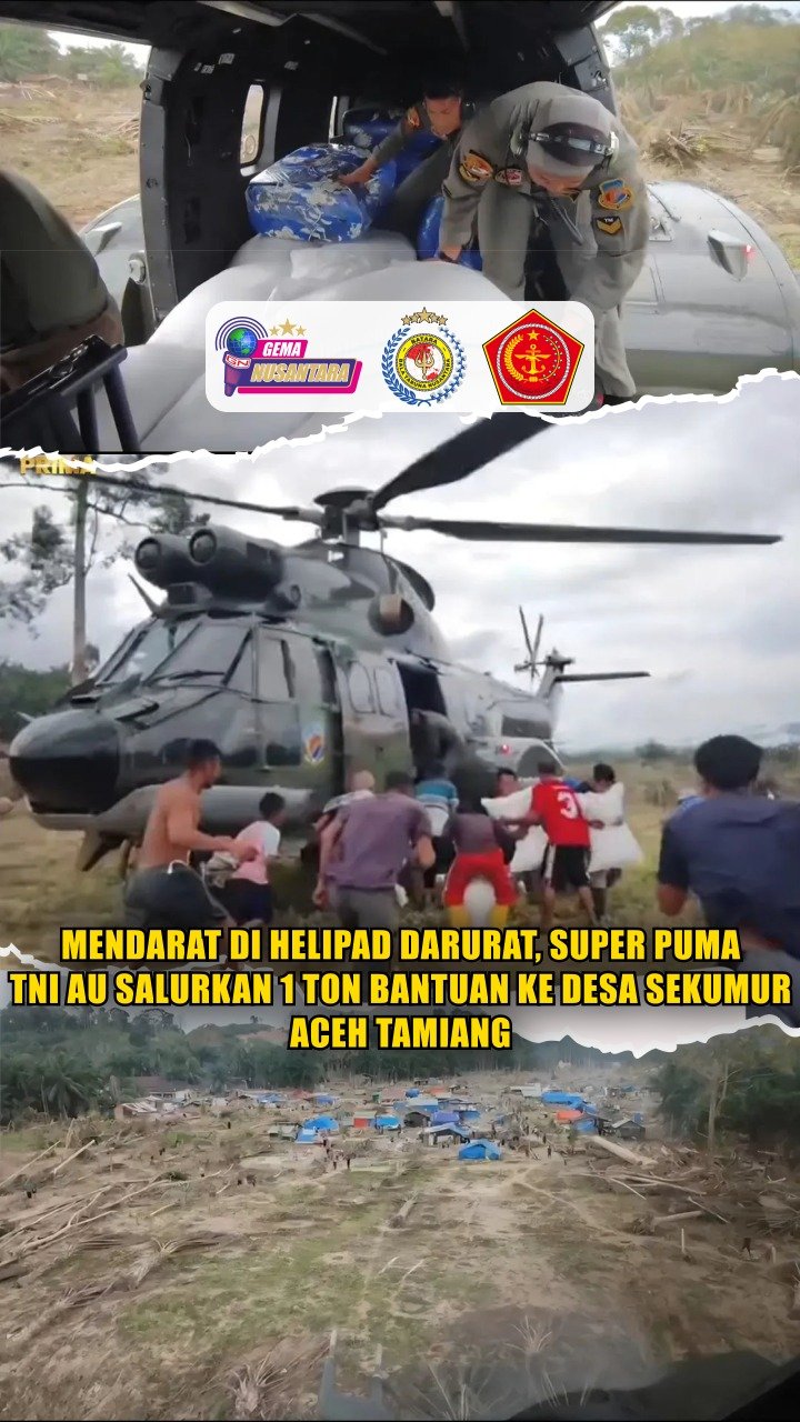 Puspen TNI – Helikopter Super Puma TNI AU yang diberangkatkan dari Lanud Soewondo, Medan berhasil mendarat di helipad darurat di Desa Sekumur, Kecamatan Sekarak, Kabupaten Aceh Tamiang, Senin (29/12/2025). Sekaligus penyaluran 1.000 kilogram bantuan bahan pangan bagi warga terdampak.