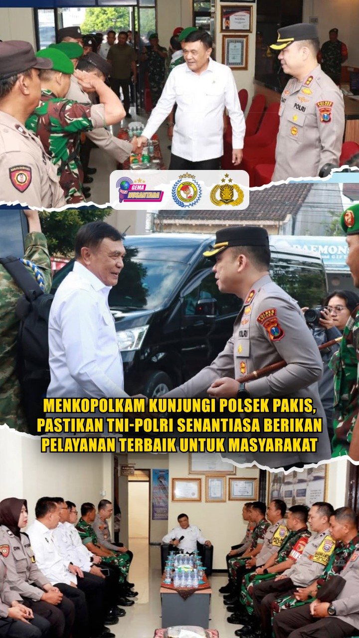 Malang – Menteri Koordinator Bidang Politik dan Keamanan (Menkopolkam) Jenderal TNI (Purn.) Djamari Chaniago melakukan kunjungan kerja ke Polsek Pakis, jajaran Polres Malang, guna memastikan soliditas TNI–Polri dalam memberikan pelayanan terbaik kepada masyarakat.