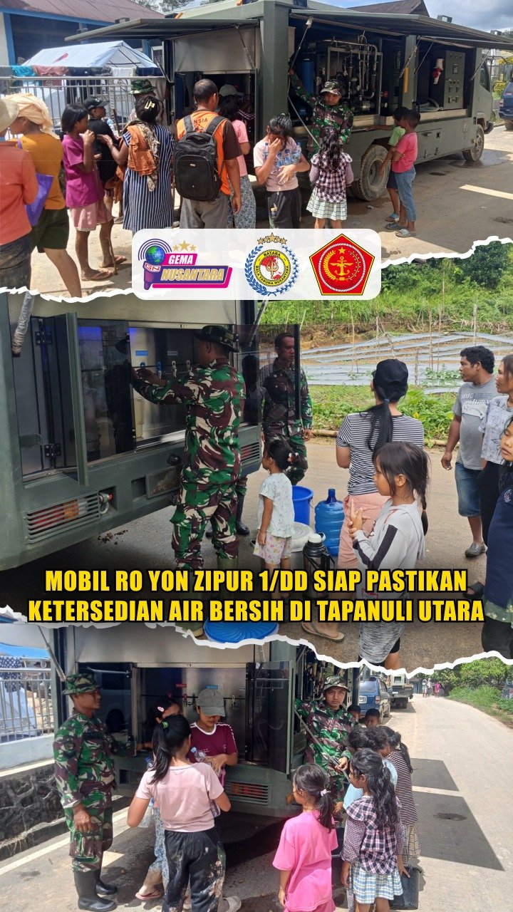 (Puspen TNI). Mobil Reverse Osmosis (RO) milik Yon Zipur 1/DD yang dioperasionalkan oleh Satgas Penanggulangan Bencana Alam (Satgas Gulbencal) Kodam I/Bukit Barisan siap menjaga ketersediaan air bersih bagi masyarakat terdampak bencana di Kabupaten Tapanuli Utara, Sumatera Utara. Dipusatkan di KM 26, Desa Lobu Pining, Kecamatan Adiankoting, sebagai titik utama pelayanan air bersih, Minggu (7/12/2025).