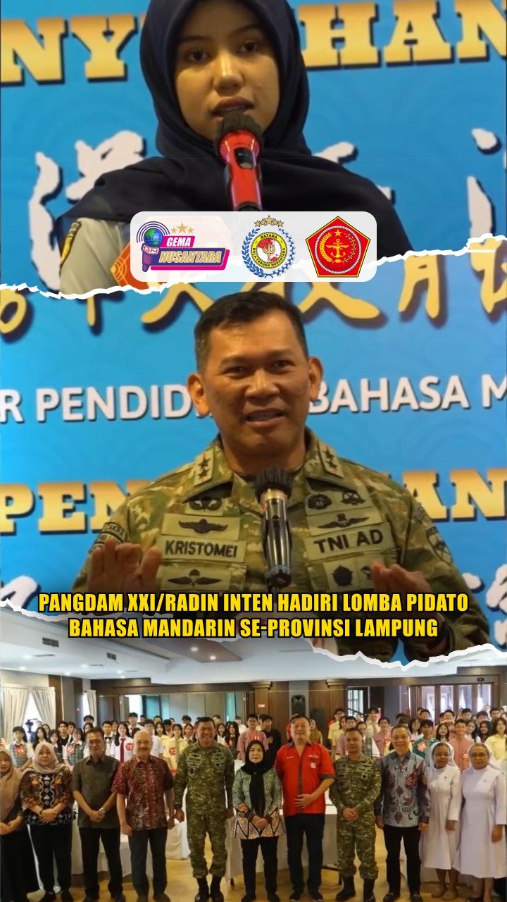 Pendam XXI/RI – Pangdam XXI/Radin Inten Mayjen TNI Kristomei Sianturi, S.Sos., M.Si.(Han)., menghadiri Lomba Pidato Bahasa Mandarin se-Provinsi Lampung di Golden Palace, Jalan Yos Sudarso, Bandar Lampung. Minggu, 2 November 2025. Turut hadir Wali Kota Bandar Lampung, Dandim 0410/KBL serta jajaran pengurus Perkumpulan Masyarakat Tionghoa Seluruh Indonesia (PMSTI) Provinsi Lampung.