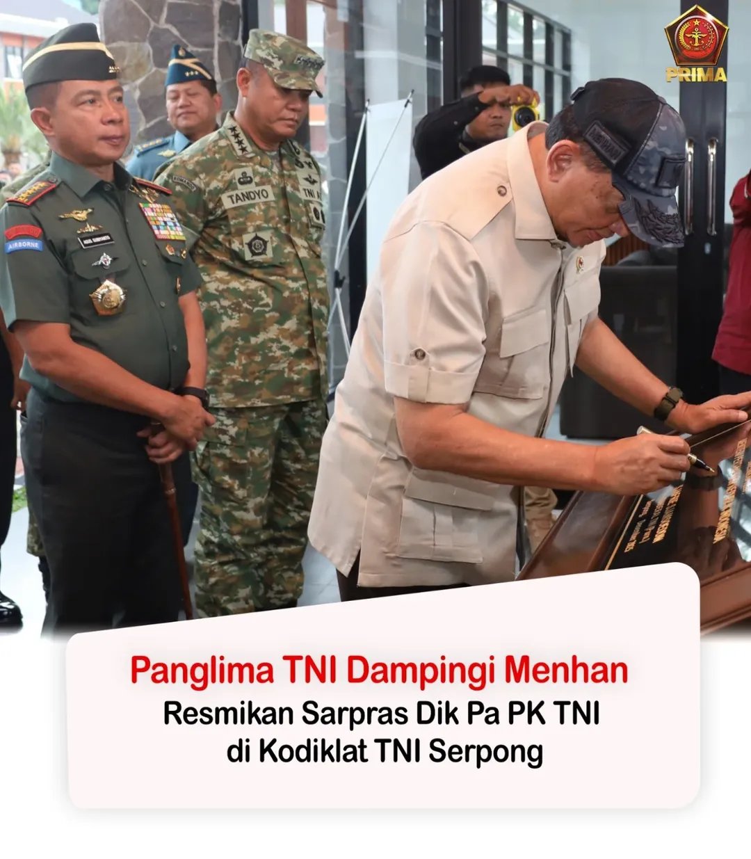 (Puspen TNI). Panglima TNI Jenderal TNI Agus Subiyanto, S.E., M.Si., mendampingi Menhan RI Jenderal TNI (Purn.) Dr. Sjafrie Sjamsoeddin, M.B.A., dalam peresmian Sarana Prasarana Pendidikan Sekolah Perwira Prajurit Karir (Sarpras Dik Pa PK) TNI di Kodiklat TNI, Jalan Buaran Hankam, Serpong, Tangerang, Senin (29/12/2025).