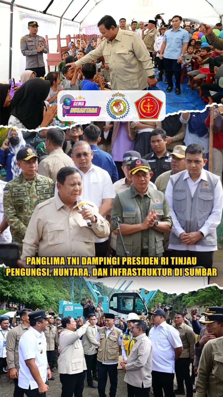 (Puspen TNI). Panglima TNI Jenderal TNI Agus Subiyanto, S.E., M.Si., mendampingi Presiden RI Prabowo Subianto meninjau sejumlah lokasi terdampak bencana di Provinsi Sumatra Barat, Kamis (18/12/2025).
