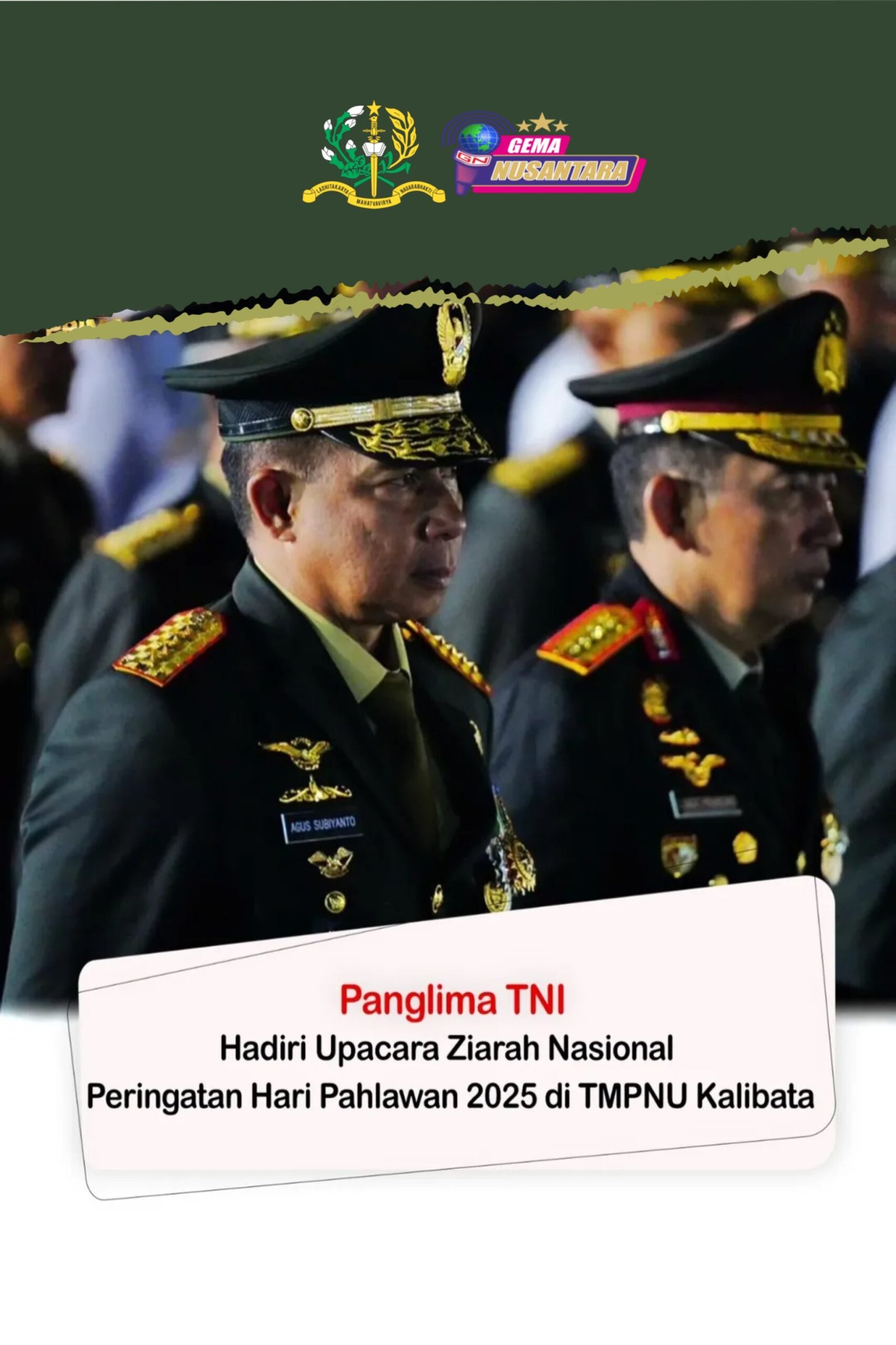 (Puspen TNI). Panglima TNI Jenderal TNI Agus Subiyanto menghadiri Upacara Ziarah Nasional dalam rangka Peringatan Hari Pahlawan Tahun 2025, dipimpin langsung Presiden Republik Indonesia Prabowo Subianto, bertempat di Taman Makam Pahlawan Nasional Utama (TMPNU) Kalibata, Jakarta Selatan, Senin (10/11/2025).