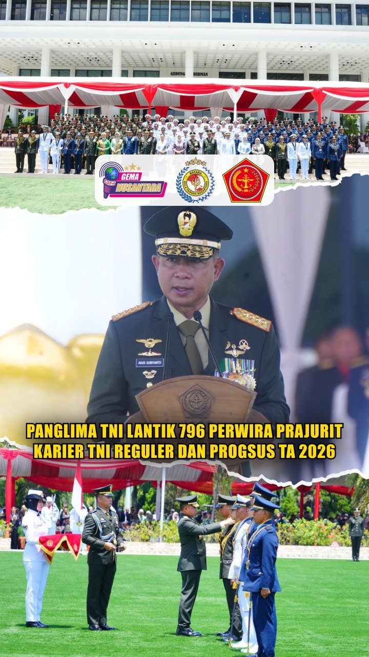 (Puspen TNI). Panglima TNI Jenderal TNI Agus Subiyanto, S.E., M.Si., melantik dan mengambil sumpah 796 Perwira Prajurit Karier (Pa PK) TNI Reguler dan Program Khusus (Progsus) Tahun Anggaran 2026 dalam upacara Prasetya Perwira yang dihadiri Wakil Panglima TNI Jenderal TNI Tandyo Budi Revita, S.Sos., Kasad, Kasal, Kasau serta Dankodiklat TNI, bertempat di Lapangan Prima Mabes TNI Cilangkap, Jakarta Timur, Kamis (12/3/2026).