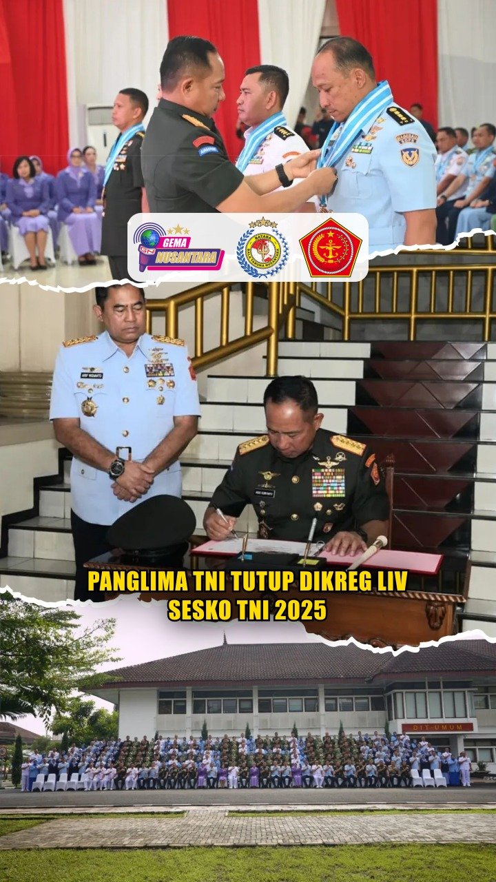 (Puspen TNI). Panglima TNI Jenderal TNI Agus Subiyanto, S.E., M.Si., resmi menutup Pendidikan Reguler (Dikreg) LIV Sekolah Staf dan Komando (Sesko) TNI Tahun Anggaran 2025 yang berlangsung di Gedung Serasan, Sesko TNI, Bandung, Jawa Barat, Kamis (4/12/2025). Di ikuti 111 Perwira Siswa yang terdiri dari 48 Pasis TNI AD, 33 Pasis TNI AL, dan 30 Pasis TNI AU.