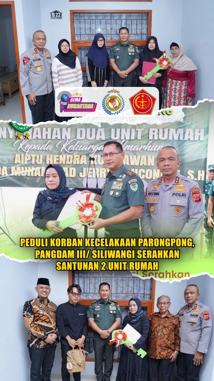 Pendam III/SLW – Pangdam lll/Slw, Mayjen TNI Kosasih, S.E., menyerahkan santunan berupa 2 unit rumah kepada ahli waris korban kecelakaan yang terjadi di Parongpong, berlangsung khidmat di Kp. Cihanjuang RT 04 RW 08, Desa Cihanjuang, Kec. Parongpong, Kab. Bandung Barat, Kamis 29 Januari 2026. Turut hadir Kapolda Jawa Barat, Irjen Pol. Dr. Rudi Setiawan, S.I.K., S.H., M.H., Jajaran PJU Kodam lll/Slw, Unsur TNI-Polri wilayah Cimahi, Forkopimcam setemlat, serta keluarga ahli waris korban.