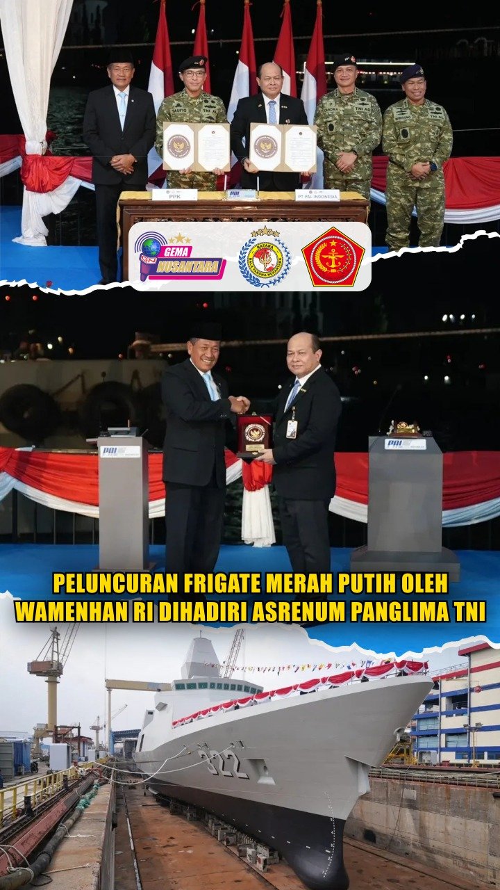 Puspen TNI – Asrenum Panglima TNI Letjen TNI Candra Wijaya menghadiri Launching Kapal Frigate Merah Putih yang dipimpin oleh Wamenhan RI Donny Ermawan Taufanto, M.D.S., M.S.P., di Dermaga Semenanjung Barat Divisi Kapal Niaga PT PAL Indonesia Jalan Ujung, Surabaya, pada Kamis (18/12/2025).