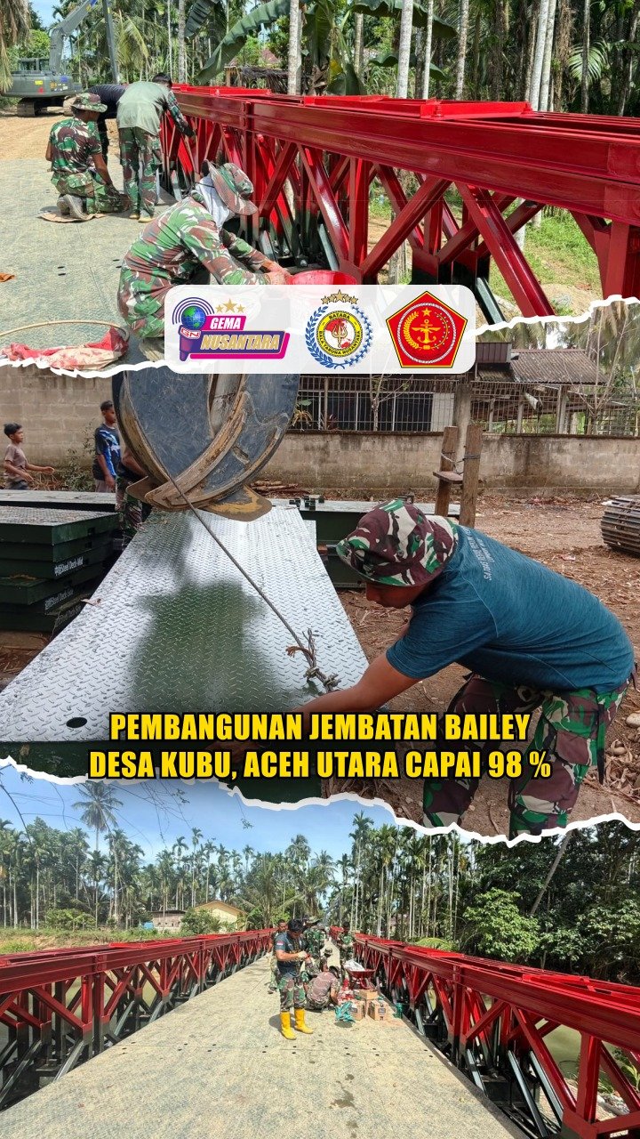 Pendam IM – Satgas Gulbencal Batalyon Zeni Tempur 5/Arati Bhaya Wighina (Yonzipur 5/ABW) melakukan percepatan pembangunan jembatan modular di Desa Kubu, Kecamatan Sawang, Kabupaten Aceh Utara dan telah memasuki tahap akhir penyelesaian dengan progres mencapai 98 persen. Senin (23/2/26).