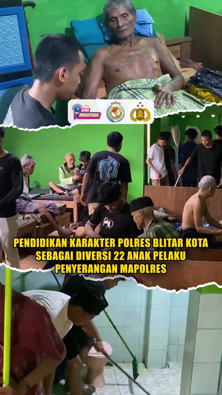 Blitar Kota – Sebanyak 22 anak pelaku penyerangan Mapolres Blitar Kota pada 30-31 Agustus 2025 menjalani kerja sosial di panti jompo Baitul Miftahul Jannah di Kelurahan Dandong, Kecamatan Srengat, Kabupaten Blitar, Jawa Timur, Minggu (5/10/2025). Berlangsung selama sekitar 2 jam, sebagai bagian dari pelaksanaan diversi terhadap para anak pelaku yang baru berusia antara 14 hingga 17 tahun.