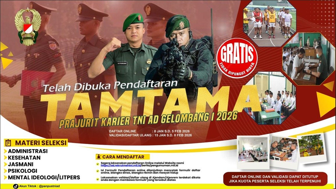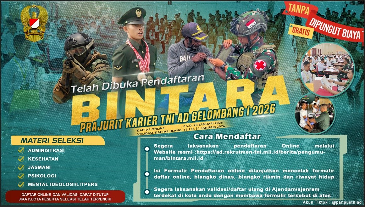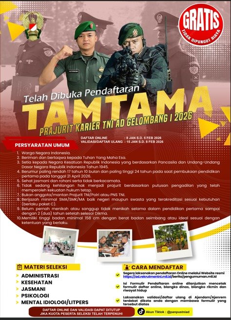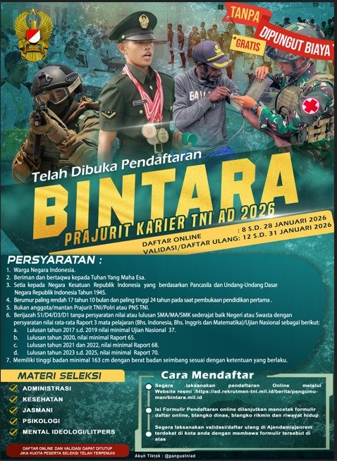 About us Headline TNIPenerimaan Prajurit TNI AD 2026 admin1 month ago1 month ago01 mins Post Views: 22 Post navigation Previous: Kapolres Malang Pimpin Rakor Pengamanan Arema FC Vs Persijap Jepara di KanjuruhanNext: Polres Malang Optimalkan Peran Ketua OSIS dalam Pemeliharaan Kamtibmas Menuju Indonesia Emas 2045 Leave a Reply Cancel replyYour email address will not be published. Required fields are marked *Comment * Name * Email * Website Save my name, email, and website in this browser for the next time I comment.