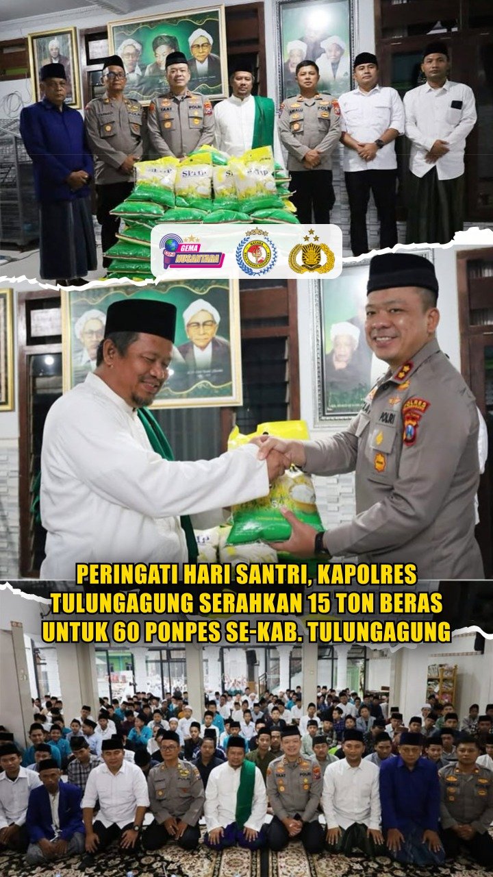 Tulungagung – Kapolres Tulungagung AKBP Muhammad Taat Resdi, S.H., S.I.K., MTCP., menyerahkan 15 ton Beras untuk 60 Ponpes se Kabupaten Tulungagung dalam rangka memperingati Hari Santri sebagai bentuk kepedulian sosial Polri kepada masyarakat.