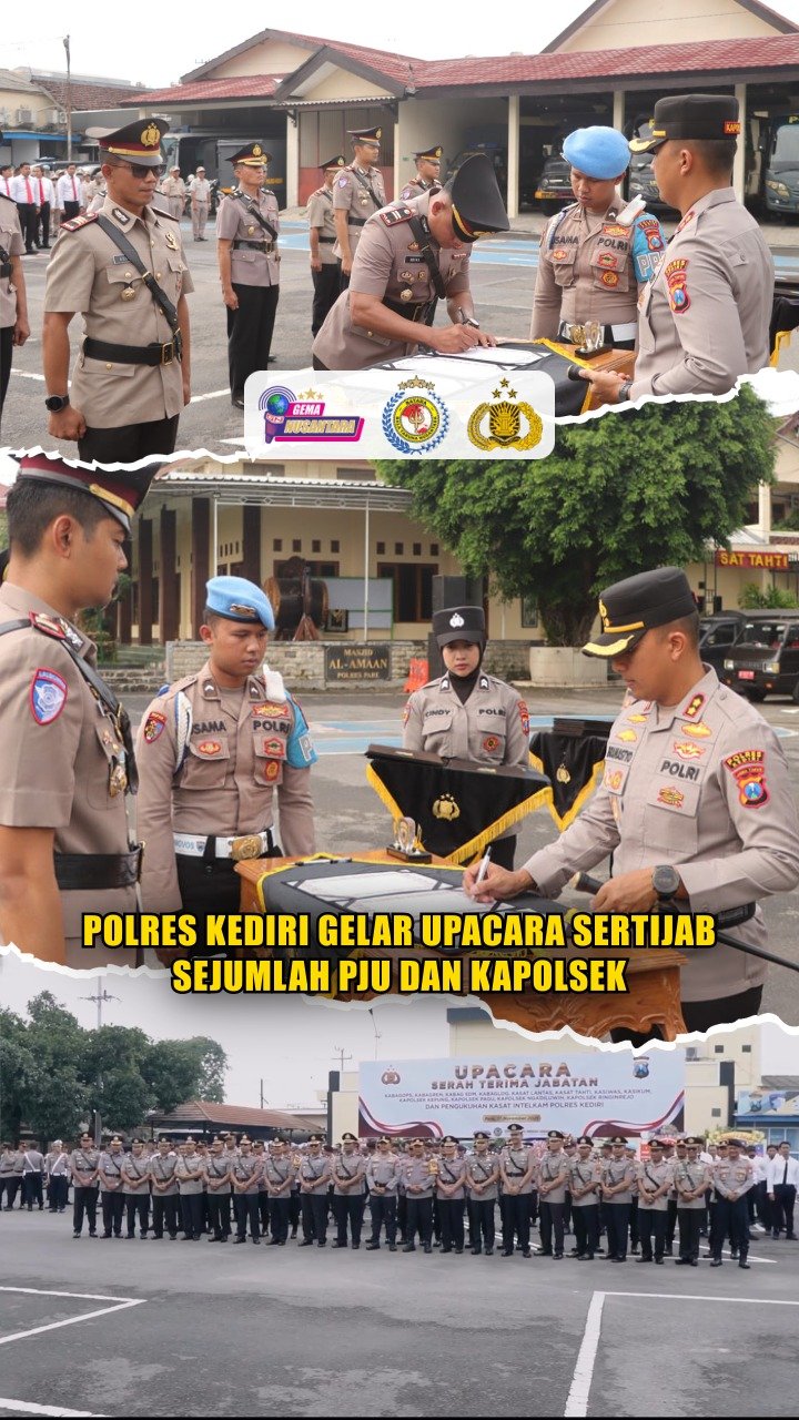 KEDIRI – Kapolres Kediri AKBP Bramastyo Priaji, S.H., S.I.K., M.Si., pimpin langsung upacara serah terima jabatan (sertijab) sejumlah Pejabat Utama dan Kapolsek jajaran, sekaligus pengukuhan Kasatintelkam Polres Kediri di lapangan apel Mapolres Kediri, Senin (17/11/2025). diikuti para PJU dan personel Polres Kediri serta Kapolsek jajaran.