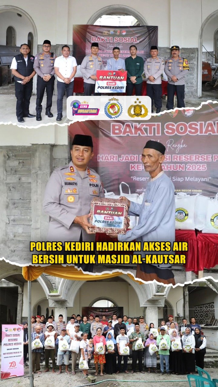 KEDIRI – Kapolres Kediri AKBP Bramastyo Priaji, S.H., S.I.K., M.Si. hadir bersama sejumlah Pejabat Utama (PJU) Polres Kediri untuk memastikan fasilitas air bersih untuk Masjid Al-Kautsar di Dusun Puhrejo, Desa Sukoharjo, Kecamatan Kayen Kidul, Kabupaten Kediri, Senin (8/12/2025). Bantuan tersebut sekaligus menjadi bagian dari rangkaian Hari Jadi Fungsi Reserse Polri ke-78 tahun 2025.
