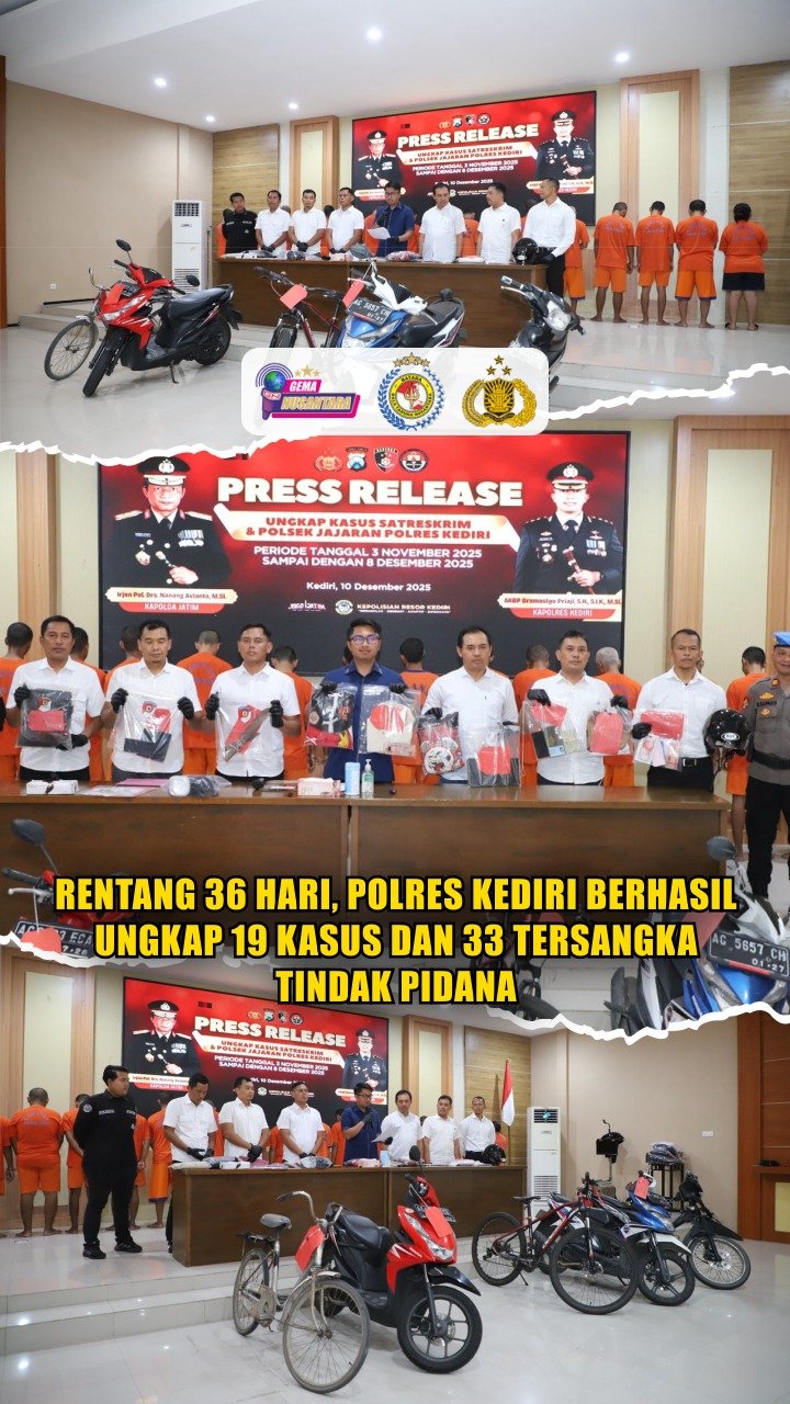 KEDIRI – Kapolres Kediri AKBP Bramastyo Priaji, S.H., S.I.K., M.Si., melalui Kasat Reskrim Polres Kediri AKP Joshua Peter Krisnawan, S.Tr.K., S.I.K., M.Sc., dalam konferensi pers menyampaikan, dalam kurun waktu 36 hari (3 – 8 Desember 2025) Satreskrim Polres Kediri berhasil menyelesaikan total 19 kasus dengan 33 tersangka, termasuk sembilan diantaranya anak di bawah umur. Rabu (10/12/2025).