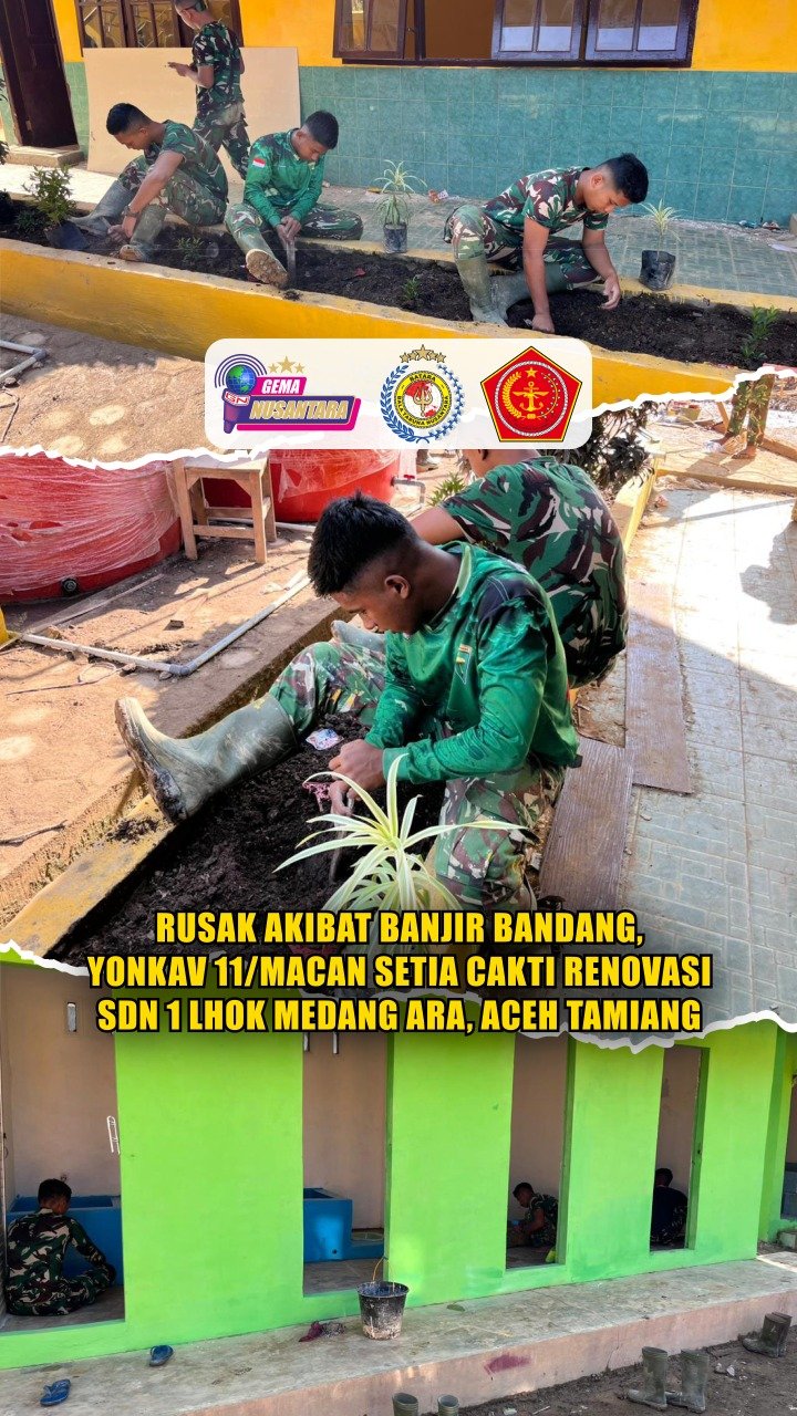 Pendam IM – Sebanyak 40 personel dari Satuan Batalyon Kavaleri 11/Macan Setia Cakti (Yonkav 11 MSC) melaksanakan kegiatan renovasi SDN 1 Lhok Medang Ara yang berlokasi di Desa Tualang Cut, Kecamatan Manyak Payeed, Kabupaten Aceh Tamiang, pada Minggu (08/02/2026).