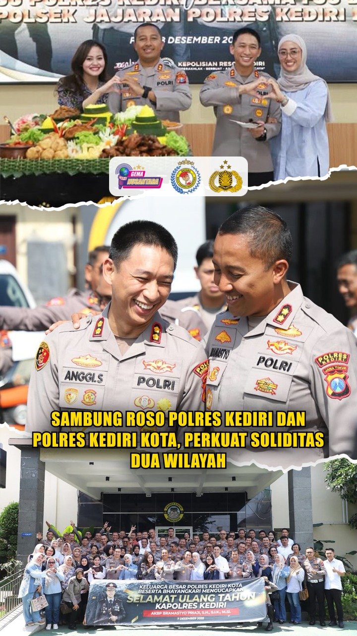 KEDIRI – Jajaran Polres Kediri dan Polres Kediri Kota, Senin (8/12/2025) menggelar kegiatan Sambung Roso. Di pimpin Kapolres Kediri AKBP Bramastyo Priaji, S.H., S.I.K., M.Si. dan Kapolres Kediri Kota AKBP Anggi Saputra Ibrahim, S.H., S.I.K., M.H. Guna saling berbagi pandangan mengenai tantangan kamtibmas ke depan, termasuk pentingnya hubungan yang solid antarwilayah untuk menghadapi dinamika keamanan di Kediri Raya.
