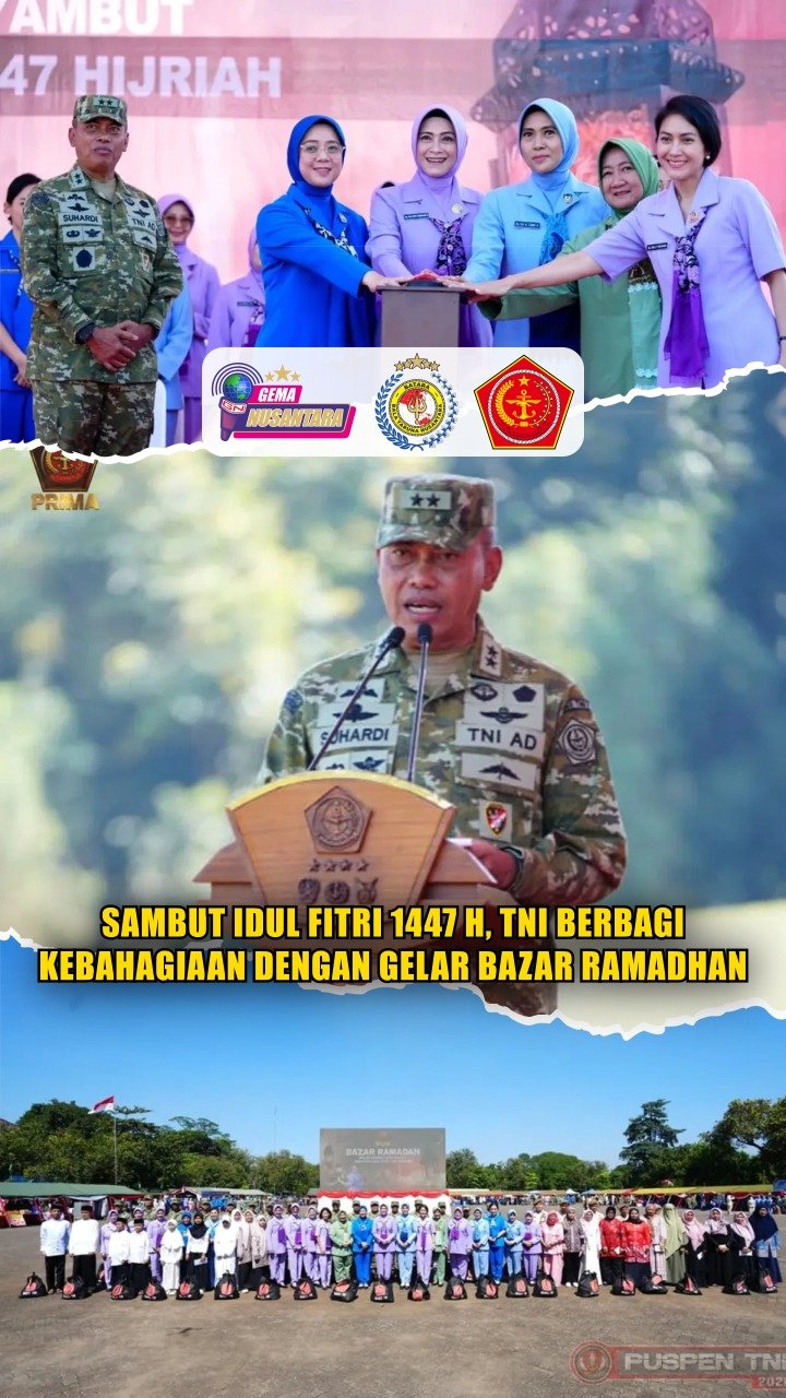 (Puspen TNI). Panglima TNI Jenderal TNI Agus Subiyanto, S.E., M.Si., diwakilkan oleh Aster Panglima TNI Mayjen TNI Suhardi membuka secara resmi Bazar Ramadan TNI dalam rangka menyambut Hari Raya Idul Fitri 1447 Hijriah/2026 Masehi, pembukaan Bazar di tandai dengan penekanan tombol oleh Ketua Umum Dharma Pertiwi Ny. Evi Agus Subiyanto, bertempat di Lapangan GOR A. Yani Mabes TNI, Cilangkap, Jakarta Timur, Jumat (13/3/2026).