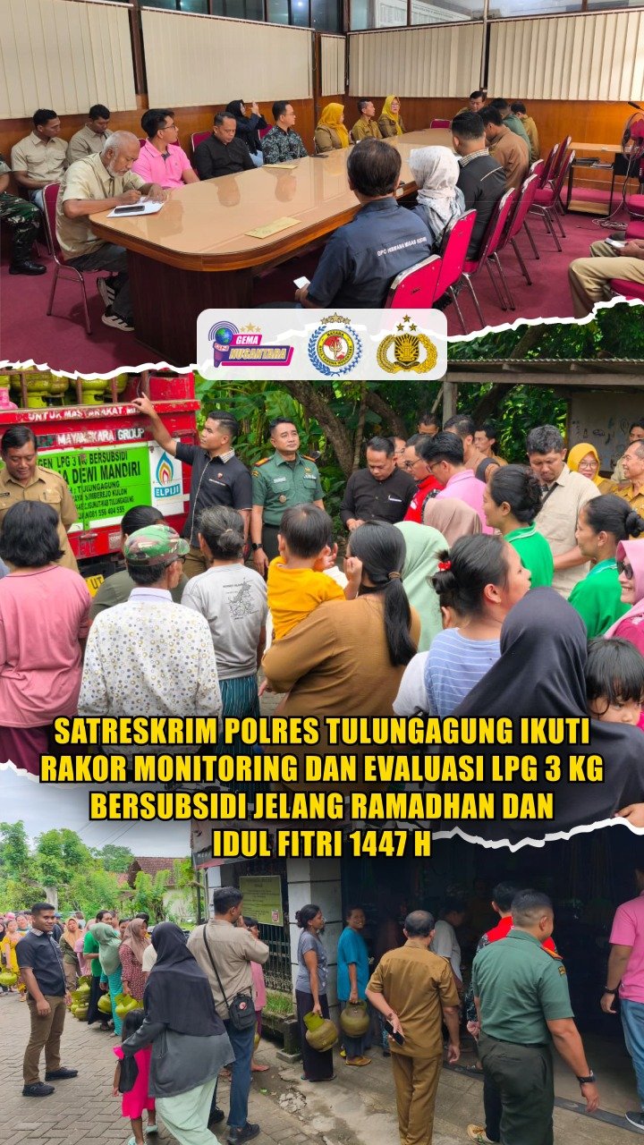 Tulungagung – Satreskrim Polres Tulungagung Ipda Muhroji, S.H., M.H. Kanit Pidek serta Aiptu Ahmad Patoni Kanit 2 Satintelkam beserta anggota mengikuti kegiatan rapat koordinasi, monitoring dan evaluasi distribusi LPG 3 Kg bersubsidi di Kabupaten Tulungagung dalam rangka menyambut Hari Besar Keagamaan Nasional (HBKN) Ramadhan dan Idul Fitri 1447 H. Berlangsung di ruang rapat Kepala Bagian Perekonomian dan SDA Setda.