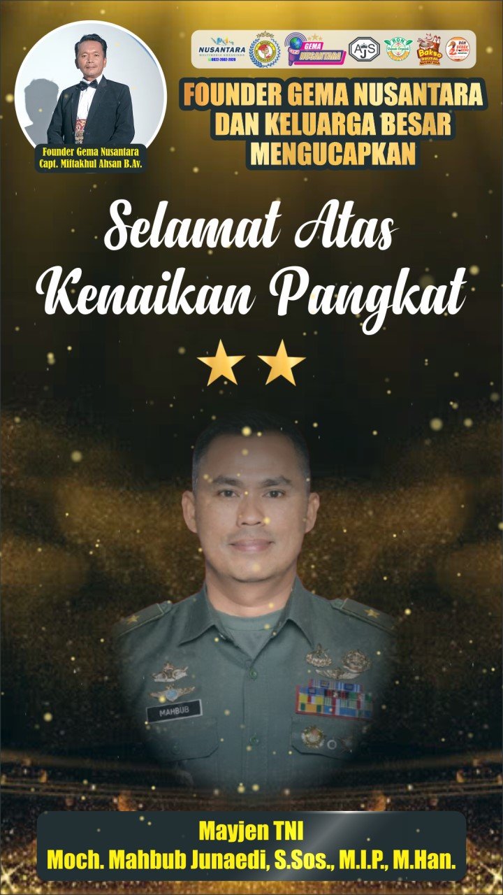 Founder Gema Nusantara Capt. Miftakhul Ahsan B.Av. Dan Keluarga Besar Mengucapkan Selamat Atas Kenaikan Pangkat Mayjen TNI Moch. Mahbub Junaedi, S.Sos., M.I.P., M.Han.