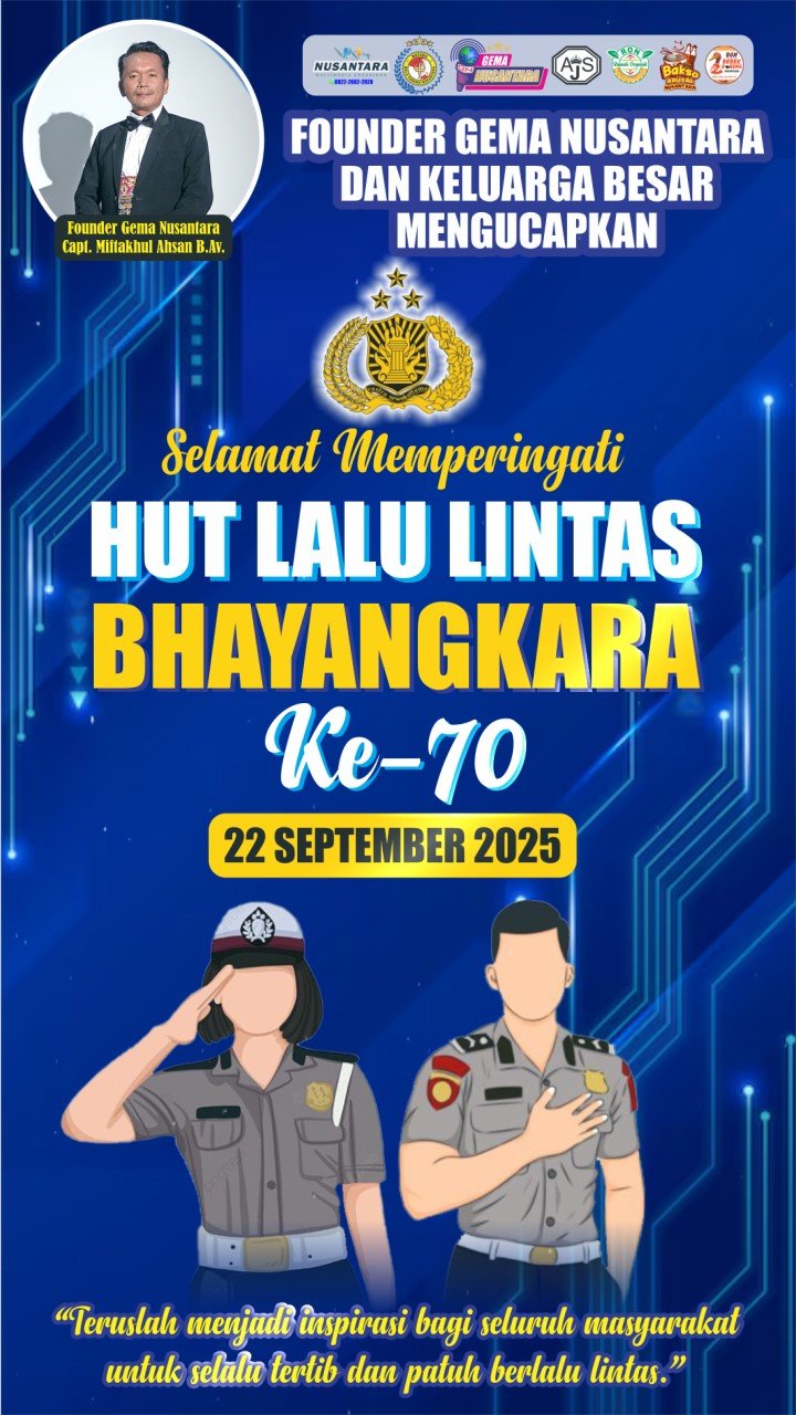 Founder Gema Nusantara Capt. Miftakhul Ahsan B.Av. Dan Keluarga Besar Mengucapkan Selamat Memperingati HUT Lalu Lintas Bhayangkara Ke-70, 22 September 2025.