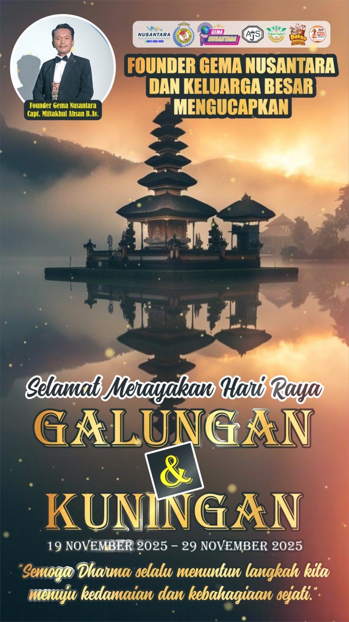 Founder Gema Nusantara Capt. Miftakhul Ahsan B.Av. Dan Keluarga Besar Mengucapkan Selamat Merayakan Hari Raya Galungan & Kuningan, 19 November 2025 – 29 November 2025.