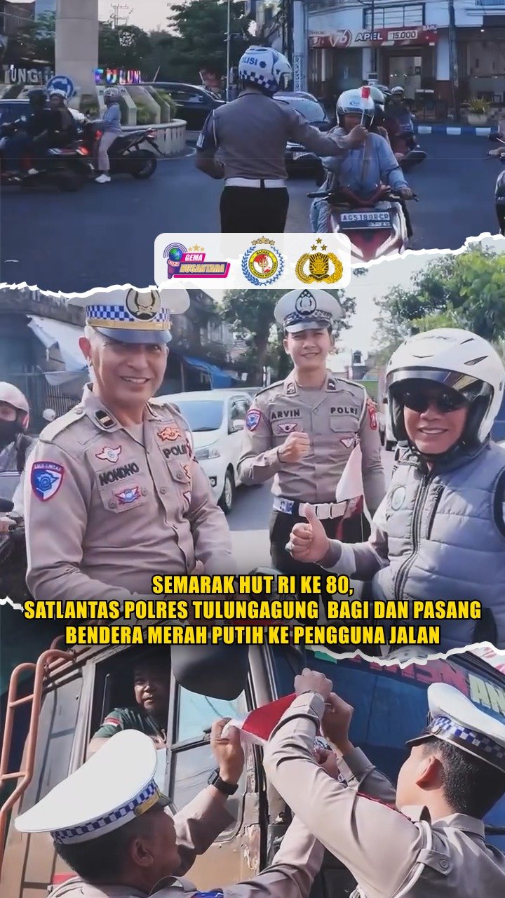 SEMARAK HUT RI KE 80, SATLANTAS POLRES TULUNGAGUNG BAGI DAN PASANG BENDERA MERAH PUTIH KE PENGGUNA JALAN