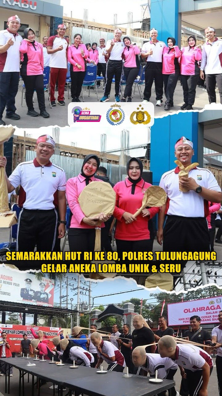 Tulungagung – Dalam rangka memperingati HUT RI ke-80 Polres Tulungagung menggelar serangkaian lomba unik dan penuh tawa yang melibatkan seluruh anggota dan bhayangkari, berlangsung di halaman Mapolres.